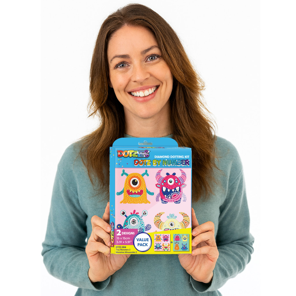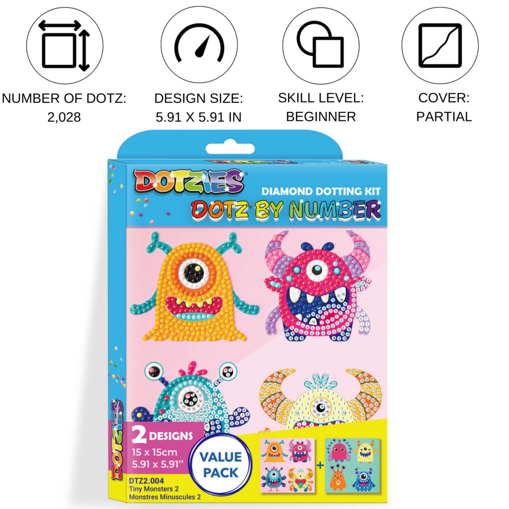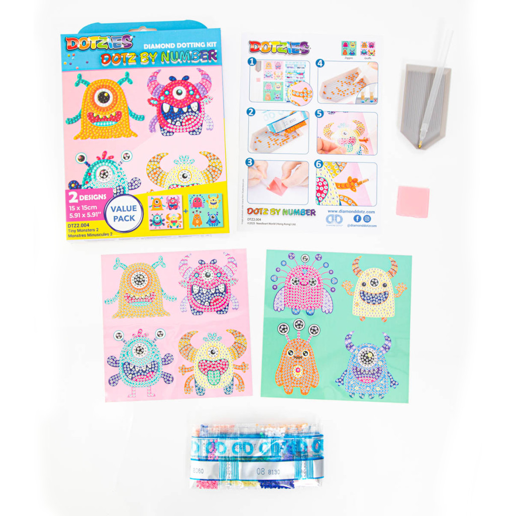 A Diamond Dotz Dotzies kreatív szett egy játékos, könnyen elkészíthető gyémántszemes alkotást kínál. A készlet több különálló mintát tartalmaz, így nem egyetlen kép készül, hanem több kisebb alkotás, amelyek lépésről lépésre állnak össze.