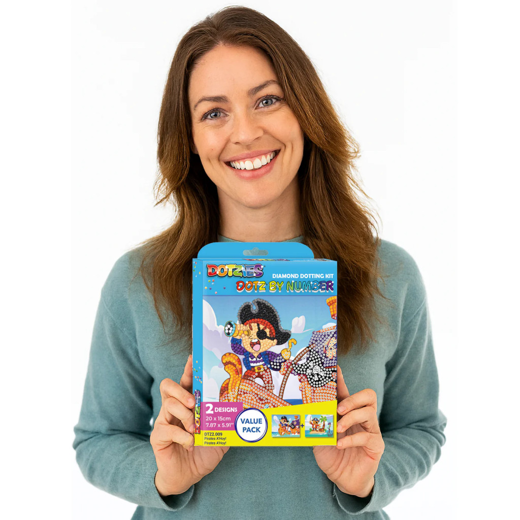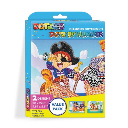 Diamond Dotz DotzbyNumber Kalózok kreatív képkészítő szett, amellyel a gyerekek számok alapján készíthetnek csillogó gyémántszemes képeket. Az egyszerűen követhető jelölések és a színes minták gyors sikerélményt adnak, miközben játékosan fejlesztik a kézügyességet és a koncentrációt.