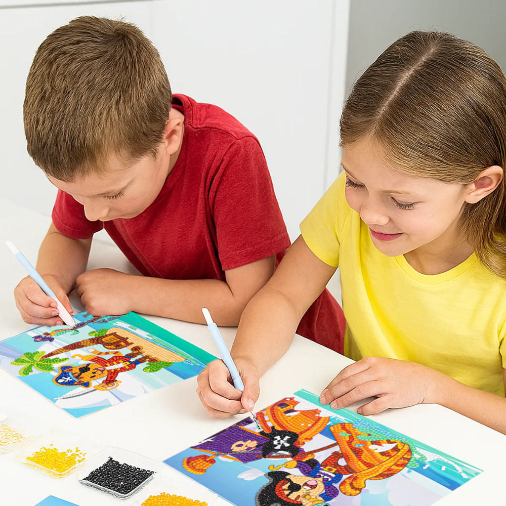 A Diamond Dotz DotzbyNumber Kalózok kreatív szett egy könnyen követhető, számokkal jelölt gyémántszemes technikát kínál, amelyet kifejezetten gyerekek számára terveztek. Az alkotás során lépésről lépésre áll össze a színes kalózos kép, miközben a folyamat egyszerűen átlátható és gyors sikerélményt ad.