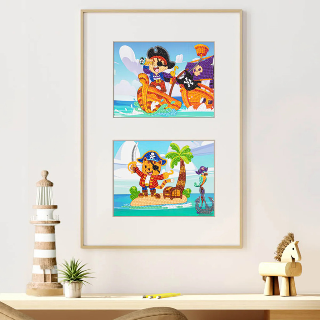 A készlet 2 darab képet tartalmaz, amelyek együtt alkotnak egy összefüggő, kalóz témájú kompozíciót. A két kép elkészítése külön-külön is élményt nyújt, együtt pedig egy látványos végeredményt ad.