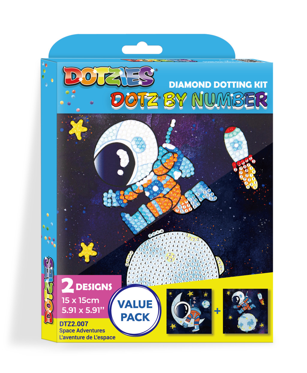 A Diamond Dotz DotzbyNumber Űrkalandok kreatív szett egy könnyen követhető, számokkal jelölt gyémántszemes technikát kínál, amelyet kifejezetten gyerekek számára terveztek. Az alkotás során színes űrjelenetek – bolygók, csillagok és űreszközök – állnak össze lépésről lépésre.