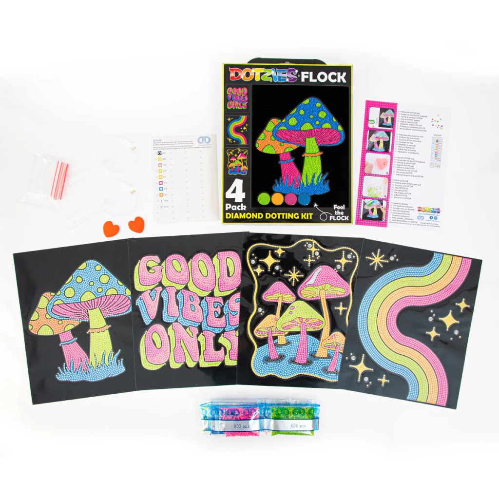 A Diamond Dotz Flock Dotz Neon – Pozitív hullámok kreatív szett egy különleges gyémántszemes alkotási élményt kínál. A bársonyos hatású háttér és az élénk neon színek egyedi, látványos végeredményt adnak, miközben az alkotás folyamata nyugodt és kikapcsoló.