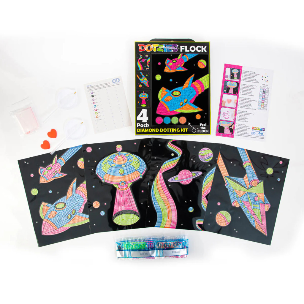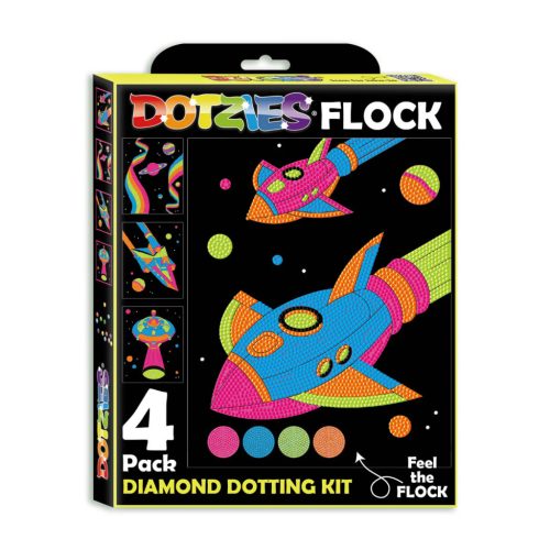 Diamond Dotz Flock Dotz Neon Űr kreatív szett, amellyel bársonyos hatású, csillogó gyémántszemes képeket készíthetsz. A neon színek és a flokkolt felület különleges megjelenést adnak, a kész képek UV-fény alatt is ragyognak.