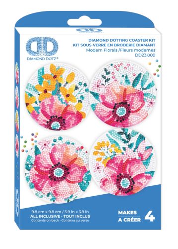 A Diamond Dotz Modern Florals poháralátét szett elegáns, virágos mintáival kreatív kikapcsolódást kínál. Ideális választás kezdőknek és dekoratív kiegészítők készítéséhez.