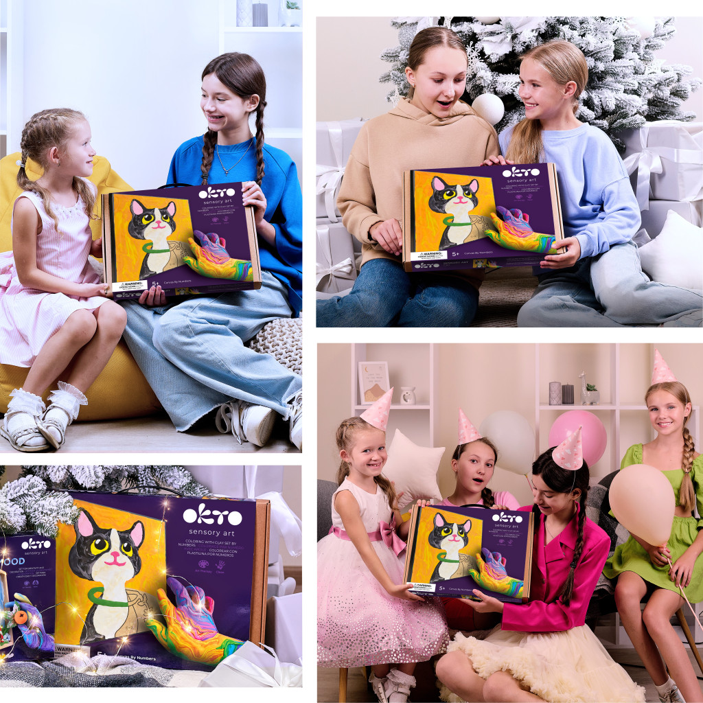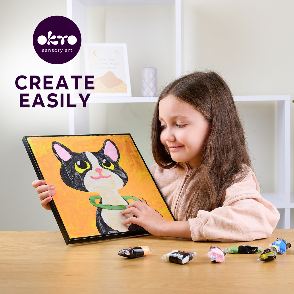Az Okto Sensory Art Kids „Gyurmázz számok szerint – Cica” készlet a klasszikus „festés számok szerint” technikát ötvözi a gyurmázással. A gyerekek a megadott színek és minták alapján egy kedves cicás képet készíthetnek el térhatású formában.