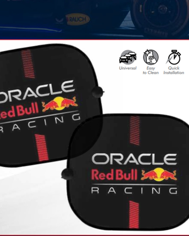 A kék színű, Red Bull mintával ellátott napvédők sportos megjelenést adnak az autó belső terének.