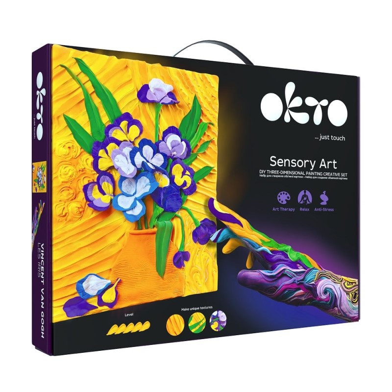 A SENSORY ART kreatív szett segítségével Vincent van Gogh Íriszek című festménye készíthető el egyedi, térhatású formában. A készletet azoknak ajánljuk, akik szeretnének kreatív módon kikapcsolódni, és szívesen alkotnának gyurmával egy különleges képet.