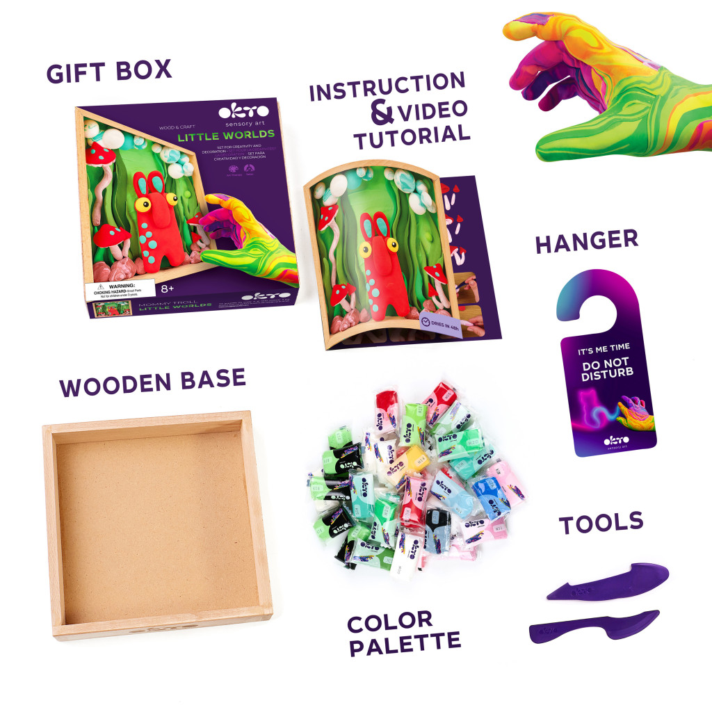 A Wood&Craft kreatív készlet Little Worlds – Mommy Troll egy levegőn száradó gyurmás DIY szett, amely egyedi, térhatású jelenet alkotását teszi lehetővé.
